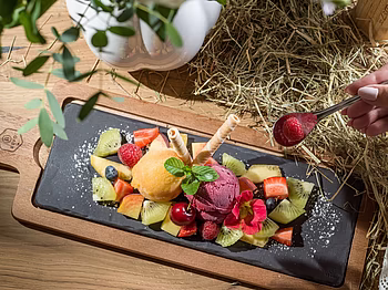 Im À-la-carte Restaurant Märzenklamm in Stumm im Zillertal erwartet dich ein Speiseangebot, das sowohl klassische Tiroler Spezialitäten als auch kreative, saisonale Gerichte umfasst. Gerichte wie hausgemachte Knödel, traditionelle Forelle, saftige Steaks oder unser Zillertaler Festtagsessen sind nur ein kleiner Teil dessen, was deine Geschmacksknospen erwartet. Ob als gemütliches Abendessen, als Genussmoment nach einer Wanderung oder als festliches Mahl — bei uns findest du genau das Richtige für deinen Geschmack. Und ja: auch vegetarische Gerichte sind dabei.